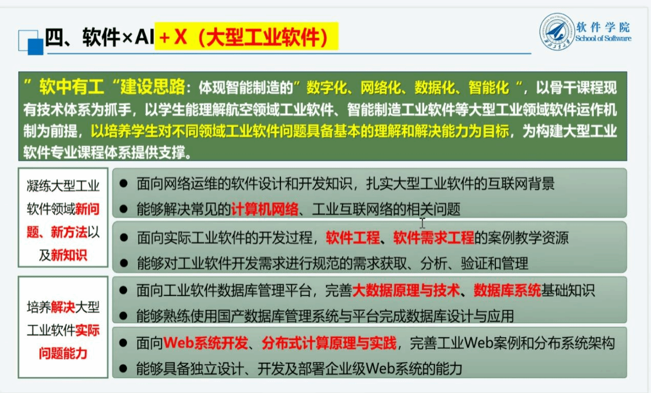 建设中,对“总师育人文化”深入践行的理念,以及软件“拔尖班”作为人才培养探索与实践的重要性。她详细阐述了拔尖班建设的总体理念。提出实行“科研学术+创新创业”相结合的双驱动模式,深化校企协同,实现新技术融入和资源共建共享。为确保学生全面发展,特别制定了5个“100%”,即入学有导师、参与科研竞赛、深入企业完成实习和毕业设计、实行本研贯通培养、国际化交流。并强调了专业综合性实践课程的重要性,为该班学生单独开设实验课程,实验内容必须涵盖“知识体验型”、“知识贯穿型”和“系统能力型”,以全面提升学生的实践能力。