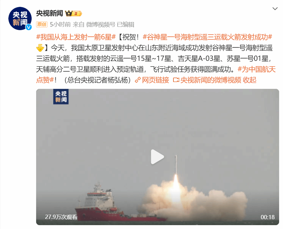 北京时间2024年8月29日13时22分,我国太原卫星发射中心在山东附近海域成功发射谷神星一号海射型遥三运载火箭,搭载发射的云遥一号15星~17星、吉天星A-03星、苏星一号01星、天辅高分二号卫星顺利进入预定轨道,飞行试验任务获得圆满成功。