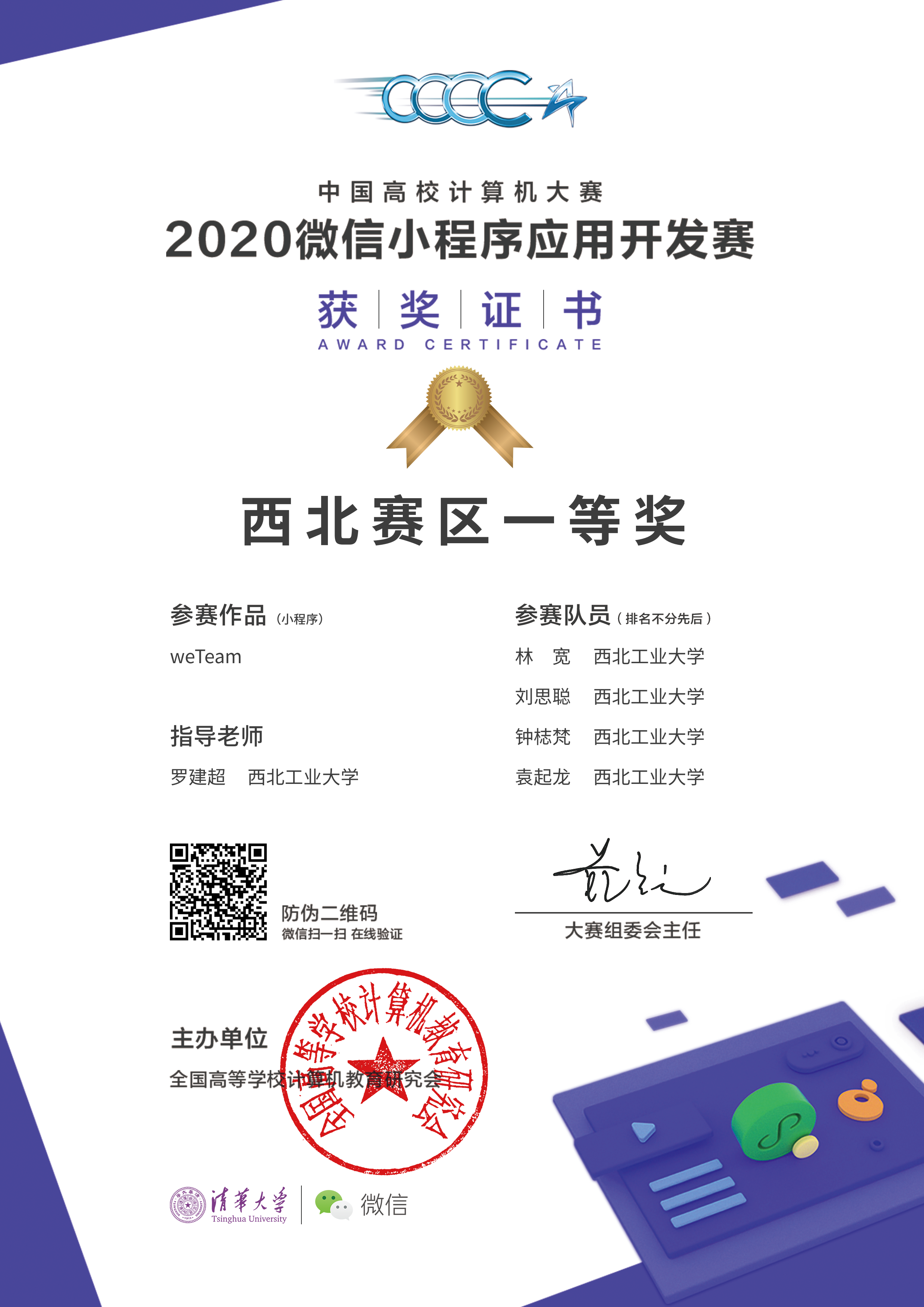 2017级本科生林宽、刘思聪及2018级本科生钟梽梵、袁起龙共同组成。“weTeam”是一款应用于高校竞赛/活动领域的小程序,旨在为各高校学生提供校园竞赛/活动信息一站式查询服务及竞赛/活动组队服务,为组织方提供一个自行发布、管理竞赛/活动的平台。