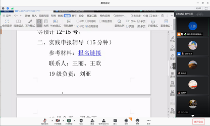 随后,会议就实践申报进行了辅导。社会实践申报立项全部在线上社会实践管理系统进行,系统于7月7日20:00正式上线。学生可进入微信公众号“漾工大”-社会实践即可注册登录。同时,参加报名的同学需在7月10日之前加入QQ群:523336402。本次社会实践的学院联系人为王丽、王欢,19级负责人为刘亚,18级负责人为邵鑫雨,17级负责人为解梦周、研究生负责人为方一帆。