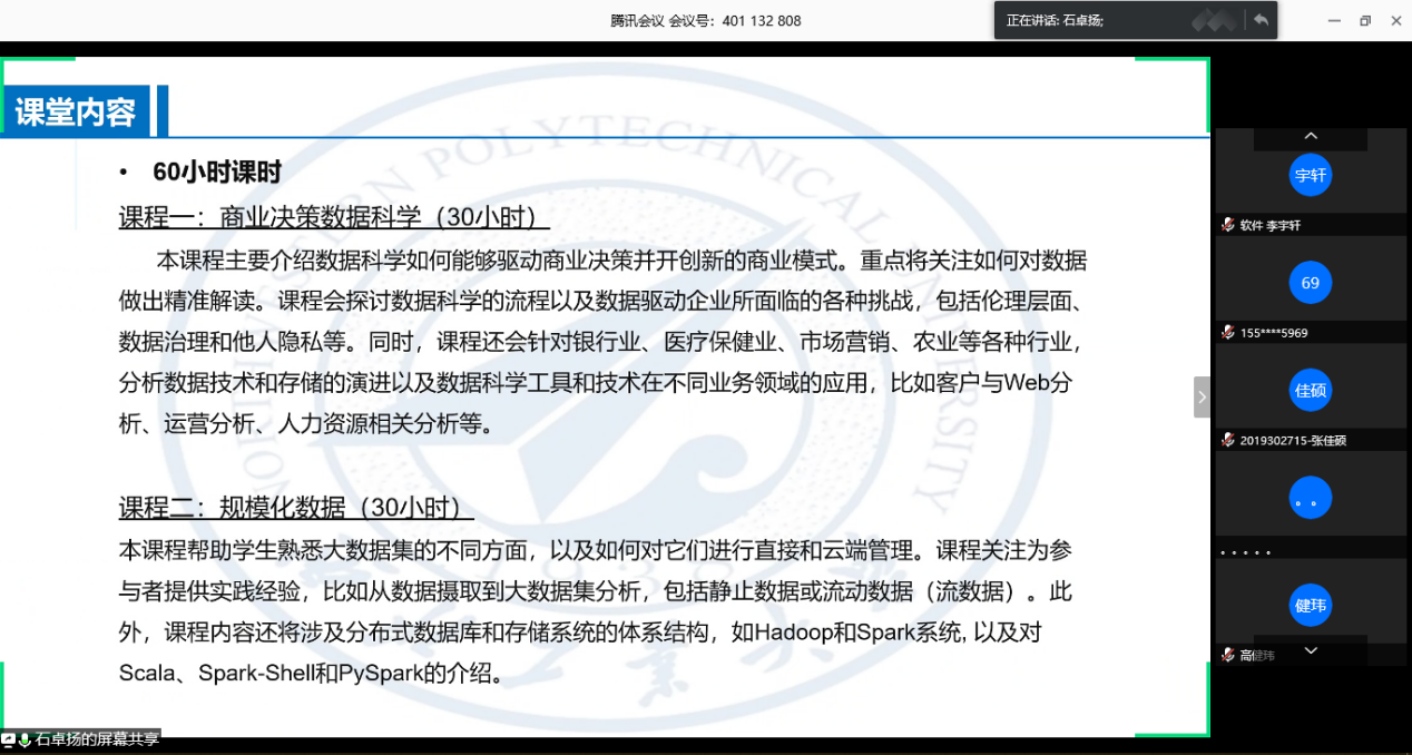 首先,肖老师向大家介绍了项目情况。墨尔本大学2020创新、创业企业领导力项目为期十天,来自我校不同学院的17位学生参与其中,项目内容主要包括:企业家、企业高管以及商学院知名讲师讲授企业知识以及亲临企业见习、创业策划培训、学生社交活动、颁发结业证书以及澳洲名校访问和悉尼歌剧院文化参观等。旨在提供给学员与澳洲企业家,企业高管面对面交流、学习的机会,从而培养学生的创新意识和创业领导力。加拿大麦吉尔大学大数据专业课程学习项目,为期3周共60学时,学生将学习如何利用定量分析方面的优势,从大型数据集中推断出有意义的业务见解。课程将向学生介绍实用的工具,以帮助学生了解如何大规模地处理数据,共包含两门课程:“商业决策数据科学”课程(30学时),“大规模数据”课程(30学时)。平均每天4学时,要求学生必须具备理工科或商科中的管理信息系统专业背景,且具备较强的数据与统计学知识,以及Linux、Java与 SQL方面的技能。