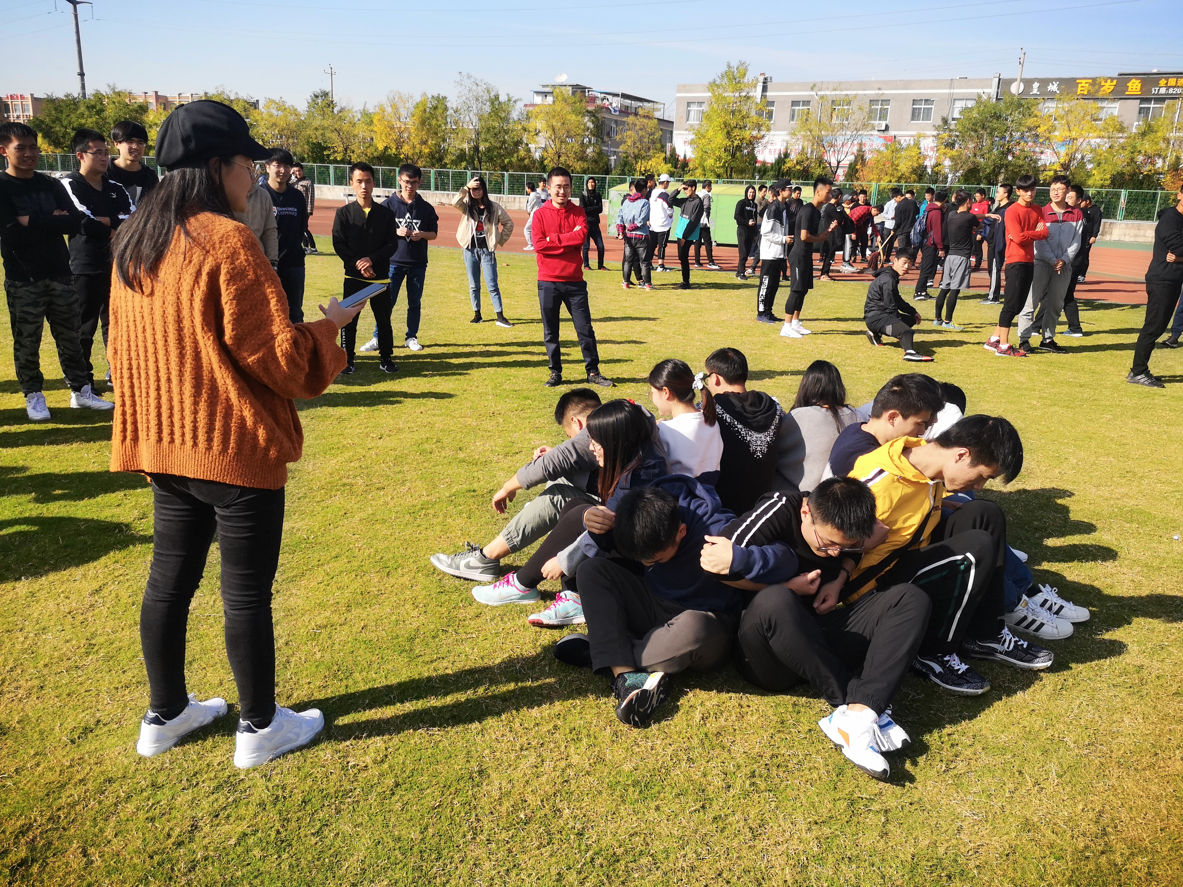 运动会上率先进行的项目叫“心心相印夹气球”,比拼的是各组成员之间的默契程度和协作能力;在云天苑操场上,大家蓄势待发,热情洋溢,完全没了来时的陌生感,晚秋的丝丝凉意也被大家的热情冲淡了。