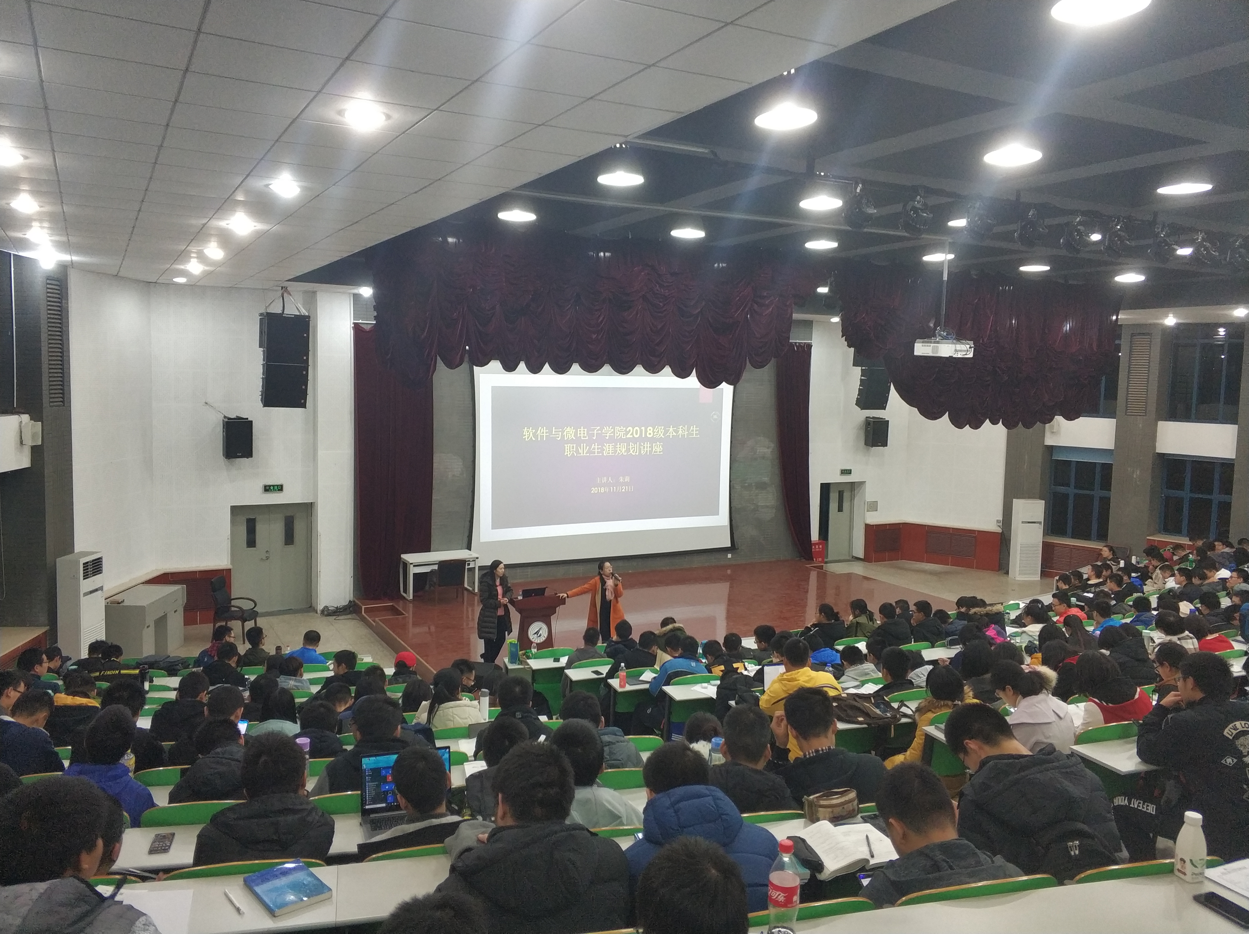 11月21日晚上7点,软件与微电子学院2018级本科生职业生涯规划讲座在教学西楼A100报告厅顺利举行。讲座邀请了学校学生职业发展指导与服务中心的朱莉老师,软件与微电子学院党委副书记张琨老师、2018级本科生辅导员樊超老师与大一本科生一起参加了本次讲座。