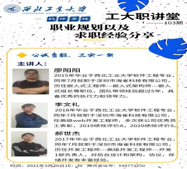 成功举办第103期“工大职讲堂”就业指导讲座。本次“工大职讲堂”邀请到了在海雀科技的贾冰以及三位校友,他们分别是2011级校友廖阳阳、2013级校友郝世杰、2014级校友李文礼三位校友,会议由高翔老师主持,各年级学生参加了此次活动。由于疫情和工作原因,本次“工大职讲堂”以线上方式进行。