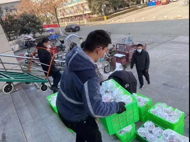 在12月29日,刘立维负责带领志愿者去云天苑餐厅二楼取餐,与餐厅负责人对接,及时在志愿者群中汇报装车及发车情况,并与其他志愿者一起将E座1329份餐食快速有序地送到宿舍,保障后续志愿者能够快速将餐食分发到各楼层。