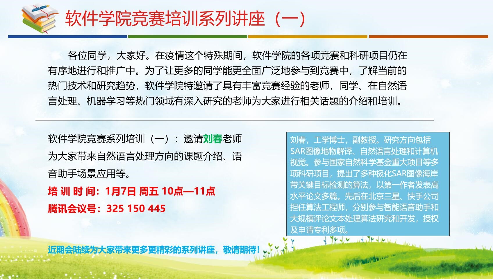 竞赛系列培训(一)︰1月7日周五10点—11点,学院邀请刘春老师为大家带来自然语言处理方向的课题介绍、语音助手场景应用等。