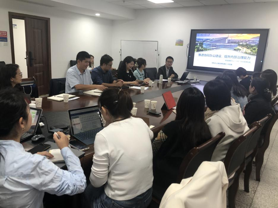 张雯鑫作了题为《推进协同办公建设,提升内部治理能力》的交流,对OA系统建设现状、新版OA系统、OA公共账号操作指南展开介绍,同时对OA操作程序做了示范,表明OA系统的建设和运用是大学现代化治理能力的重要体现,OA系统集办文办事办会为一体,是让师生少跑腿,资源都共享,流程更便捷的具体抓手。张老师的培训和分享使全员职工对OA系统的使用有了更深的了解,加强OA的日常使用,将有效促进学院规章制度建设、工作流程规范、信息高效流转。