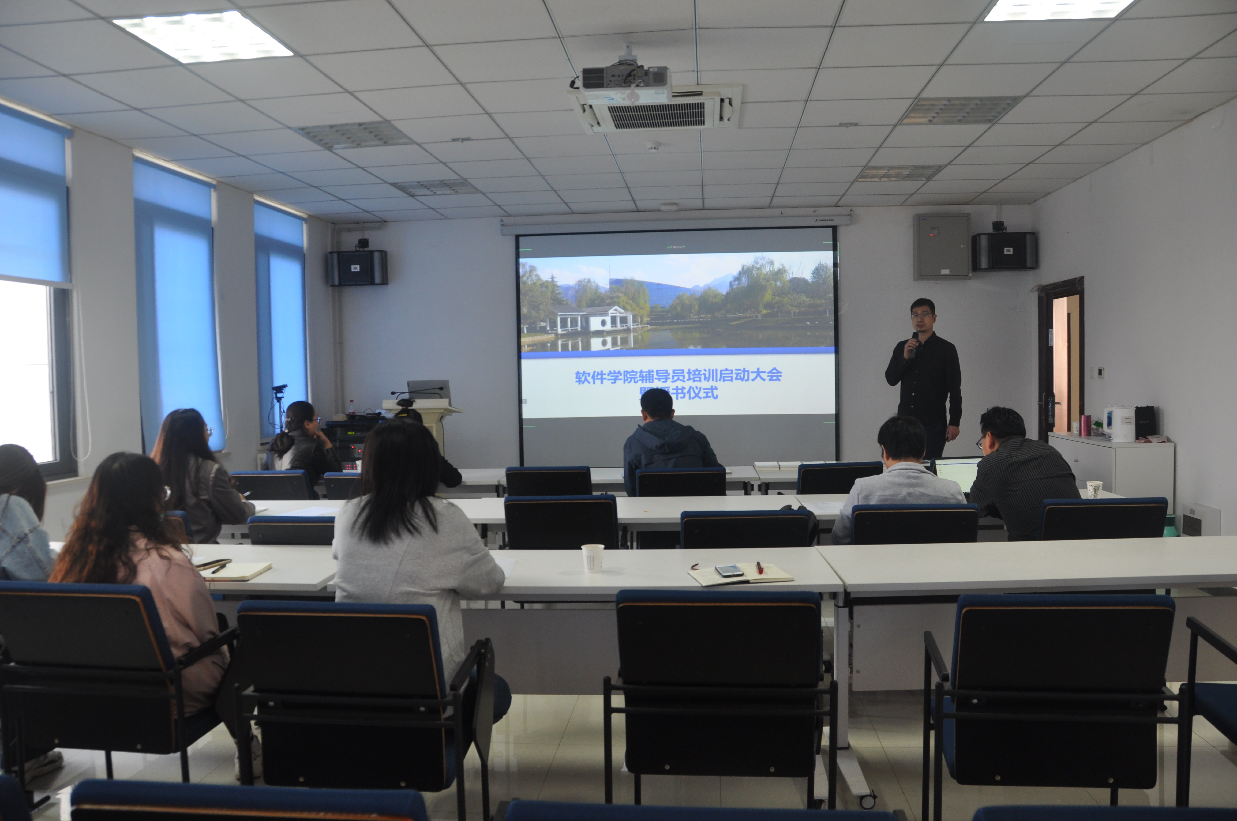 在启翔楼401报告厅召开辅导员培训启动大会暨授书仪式。党委副书记(主持工作)李晗,党委副书记张龙,专职辅导员张记国、高利鹏、吴逾强(线上),以及学生工作助理、兼职辅导员参加会议,特邀学校办公室校务工作科戴卓、番号