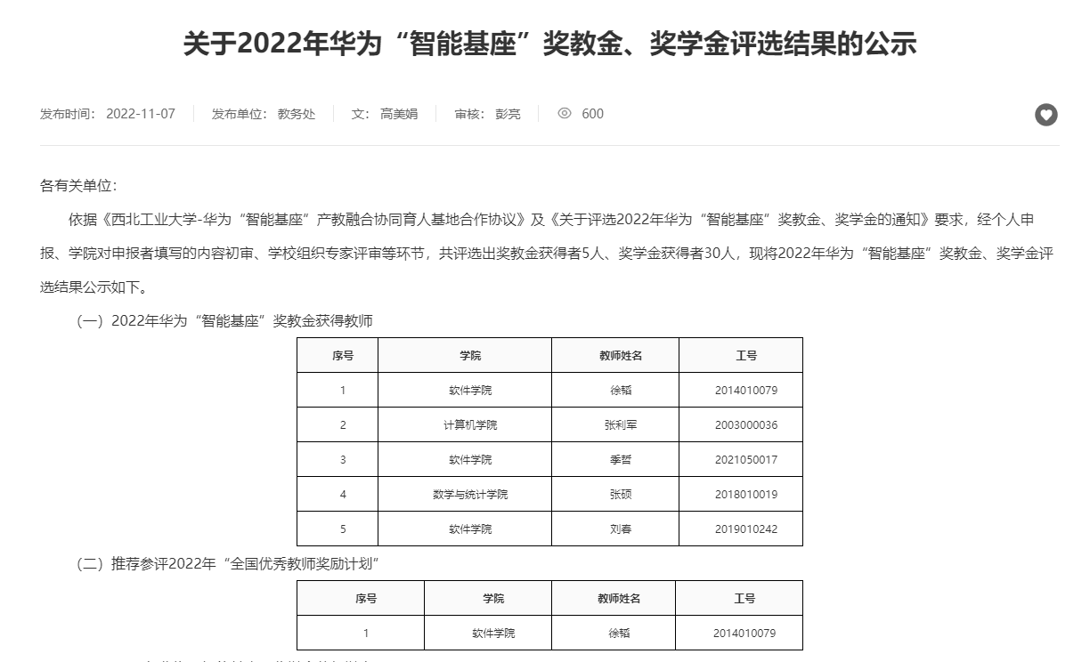 近日,2022年华为“智能基座”奖教金、全国优秀教师奖励计划评选结果出炉公示。番号