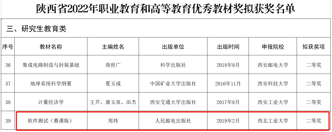 全面贯彻党的教育方针,落实立德树人根本任务,一直将教材建设作为学院重点工作之一,创新教材建设理念,增强教材育人功能,不断提升教材管理水平。“十四五”以来,学院已出版研究生教材2部,另立项建设中研究生教材4部。其中郑炜副教授主编的教材《软件测试(慕课版)》近日荣获“陕西省2022年职业教育和高等教育优秀教材奖”研究生教育类二等奖。