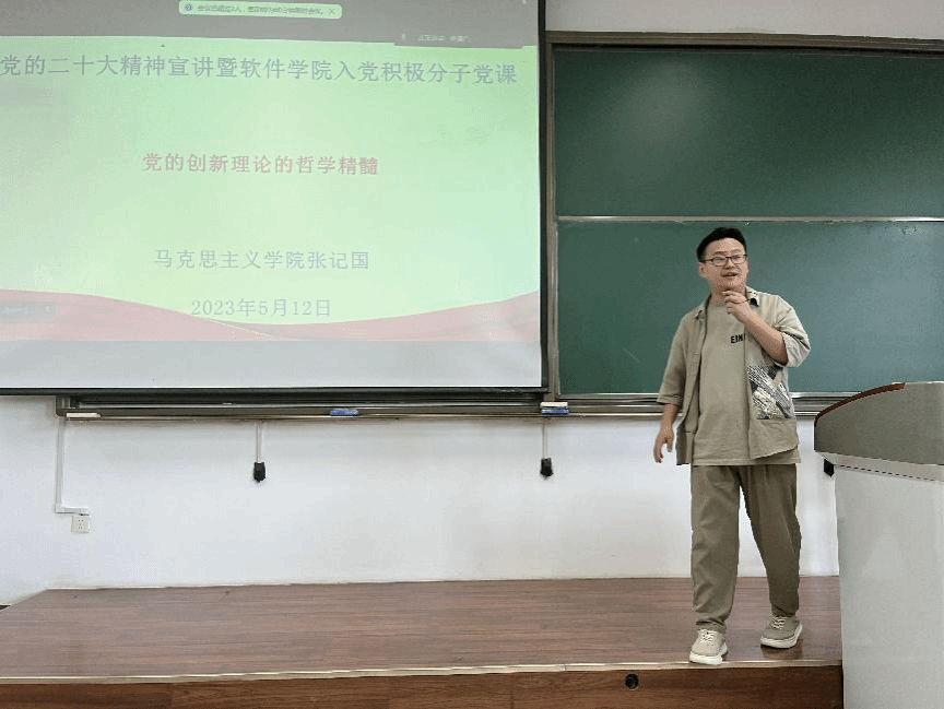 专职辅导员张记国担任主讲,给全体学员带来《党的创新理论的哲学精髓》的专题讲座。