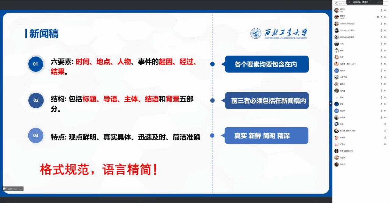 其次会议强调了一些新闻稿撰写以及投稿中的注意事项,如新闻稿需用新闻体撰写、选取图片要有代表性等。