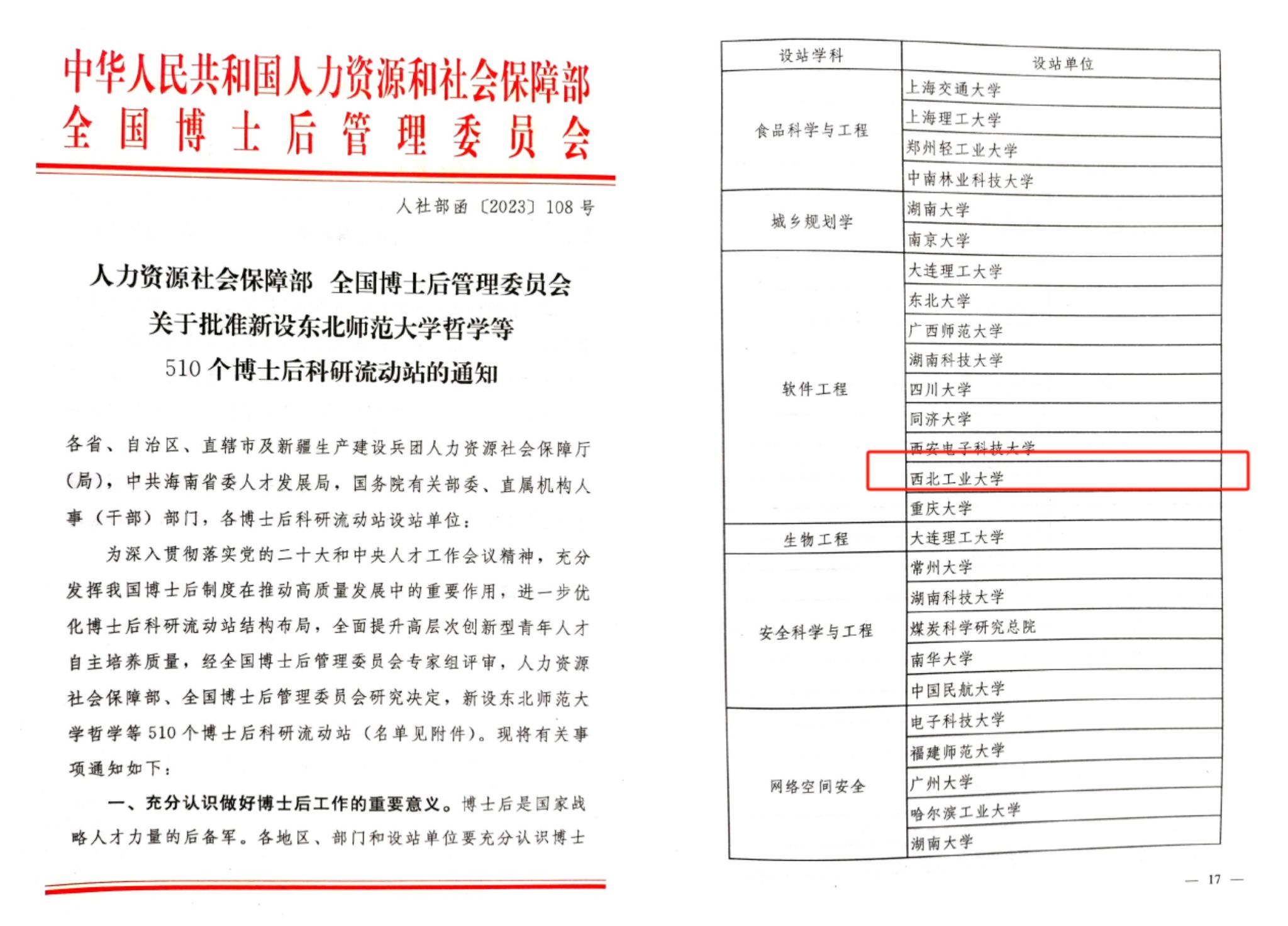 近日,人力资源和社会保障部、全国博士后管理委员会联合下发《关于批准新设东北师范大学哲学等510个博士后科研流动站的通知》(人社部函〔2023〕108号),番号