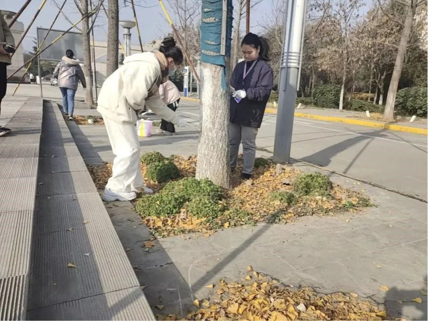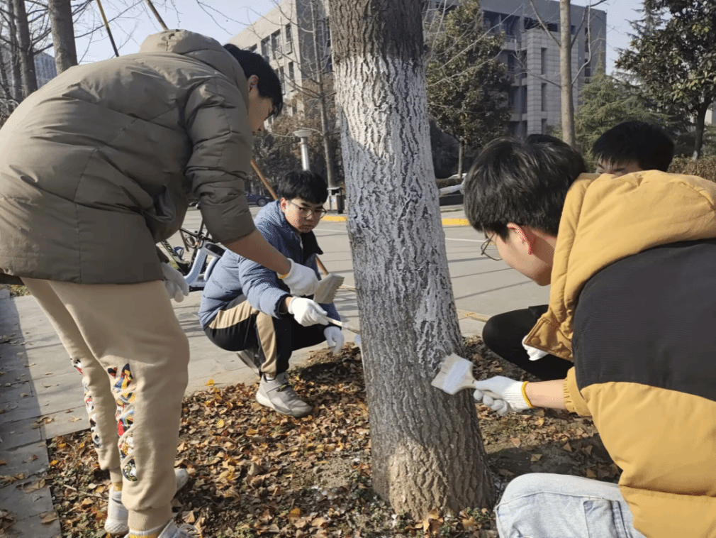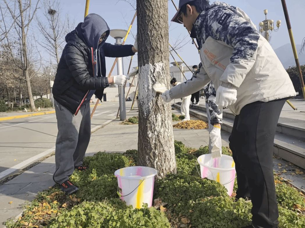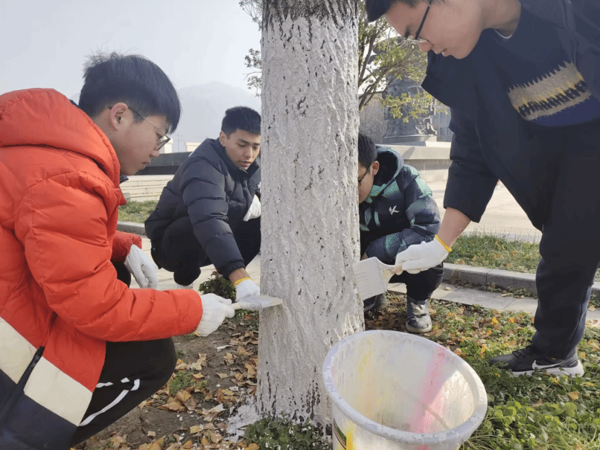 活动过程中,同学们多人一组,团结协作,经过两个小时的努力,何尊广场道路的树木全部被覆盖涂白。最后同学们将工具回收,圆满完成本次“树木涂白”活动。