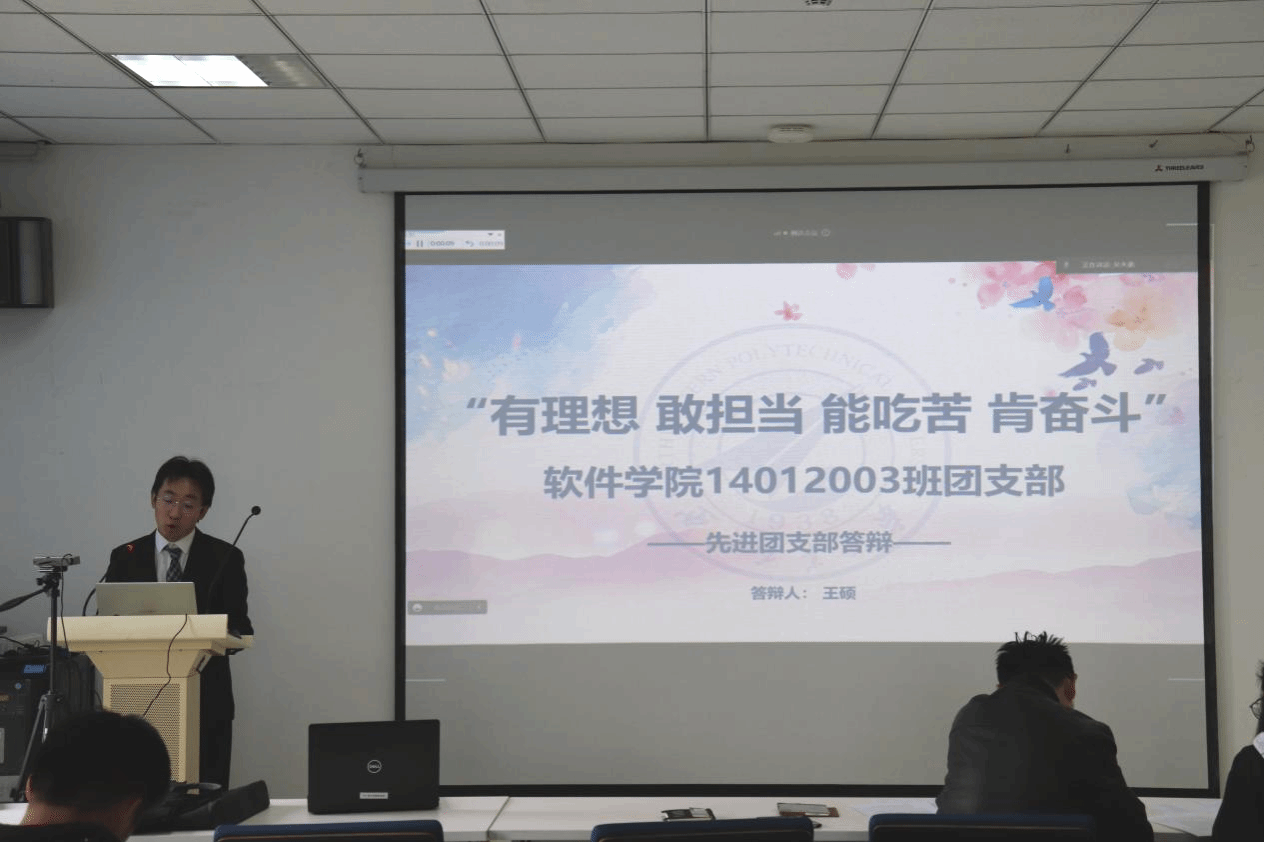 随后,先进团支部代表进行答辩。14012109团支部的团支书韩莹围绕支部的建设、管理、活动和未来展望展开答辩,详细讲述了支部的日常工作、学习活动、专题会议、学风建设等工作。之后,王俊豪、白梦娇、陈军、王硕等代表也代表各自的团支部进行答辩,无法到会的同学采取线上答辩的形式。张记国老师和胡雅心老师进行点评并提供建议,同学们都受益匪浅。