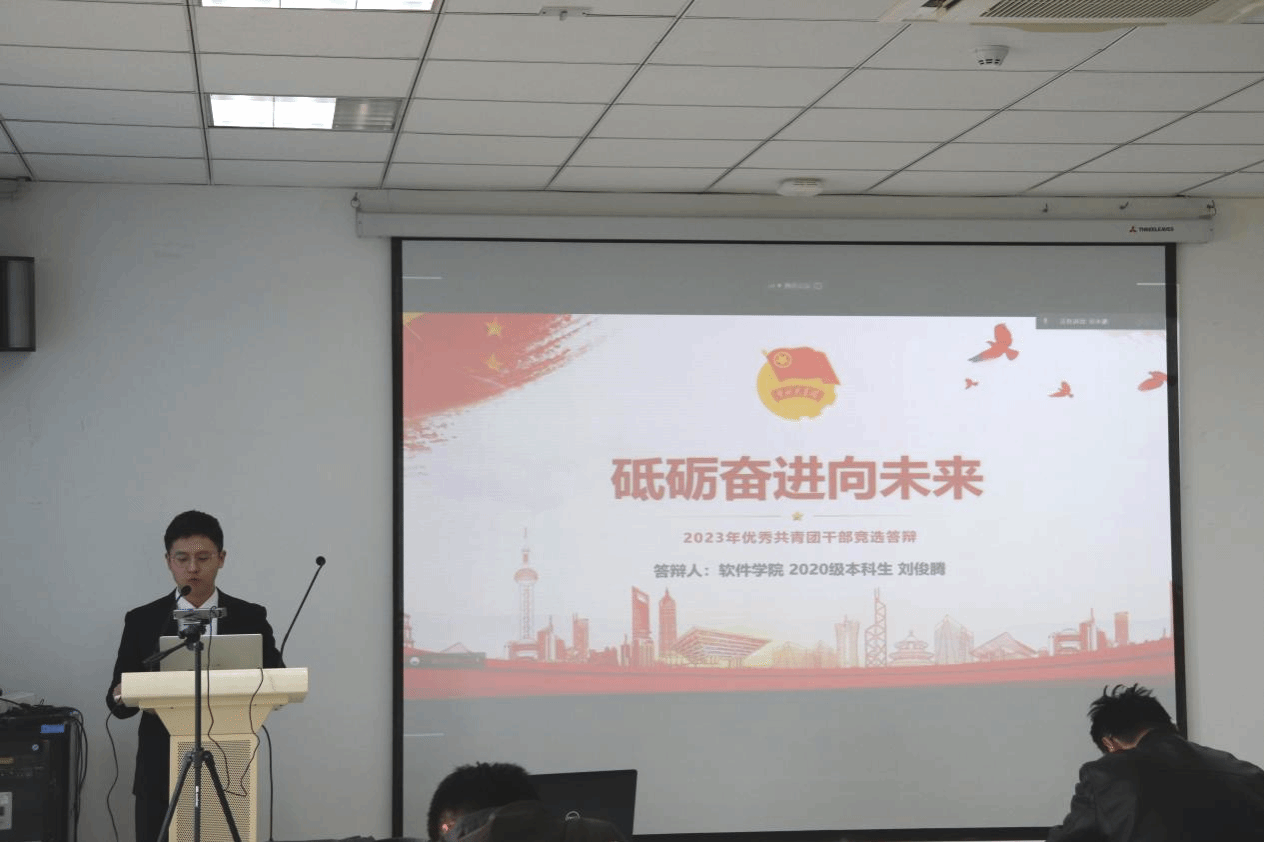 首先,五四红旗标兵答辩候选人周子龙进行答辩。他从学生工作、个人成绩、所获奖项、社团经历等多方面讲述个人事迹,展现了自身的能力。刘俊腾同学也进行了该奖项的答辩,在发言中,他详细讲述了自己加强思想建设,投身志愿服务,争当青年先锋的经历,展现了时代青年的风貌。