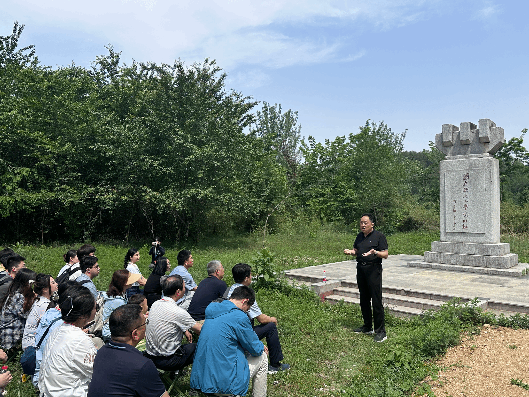在古路坝国立西北工学院旧址,大家围坐在师昌绪先生亲笔题写的“国立西北工学院”石碑前,城固县博物馆原馆长苟保平老师深情讲述了国立西北工学院在此办学的烽火岁月,党员们围坐聆听,在峥嵘校史中重温 “公诚勇毅” 的校训精神。面对党旗,全体党员庄严重温入党誓词,让信仰的力量在先烈奋斗过的土地上再次升腾。