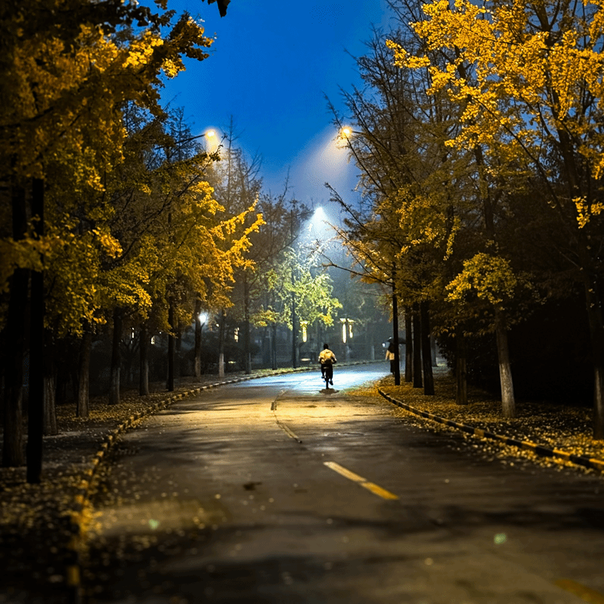 这张照片充满了秋夜的氛围,路灯的柔光穿透夜晚的薄雾,点亮了两旁金黄色的银杏树叶,营造出一种温暖的意境。路面上点缀着落叶,显得格外诗意。画面中心是一位骑行的人影,缓缓穿过这条蜿蜒的小路,给这幅静谧的夜景增添了一丝动感。这张照片仿佛在讲述一个关于孤独与沉思的故事,让观者仿佛能听到微风穿过树叶的沙沙声和自行车轮划过路面的轻响。