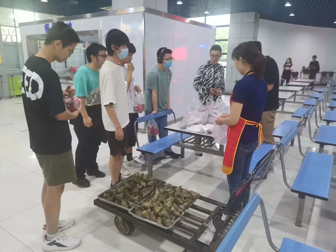 热气腾腾的粽子在云天苑餐厅出锅,一份份地装好,和精致的香包一起等待着同学们来领取。随粽子和香囊一同赠出的,还有来自番号