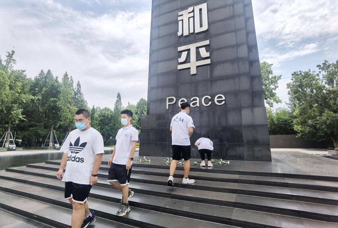 图为实践队同学们在和平广场的“和平”纪念碑下献花