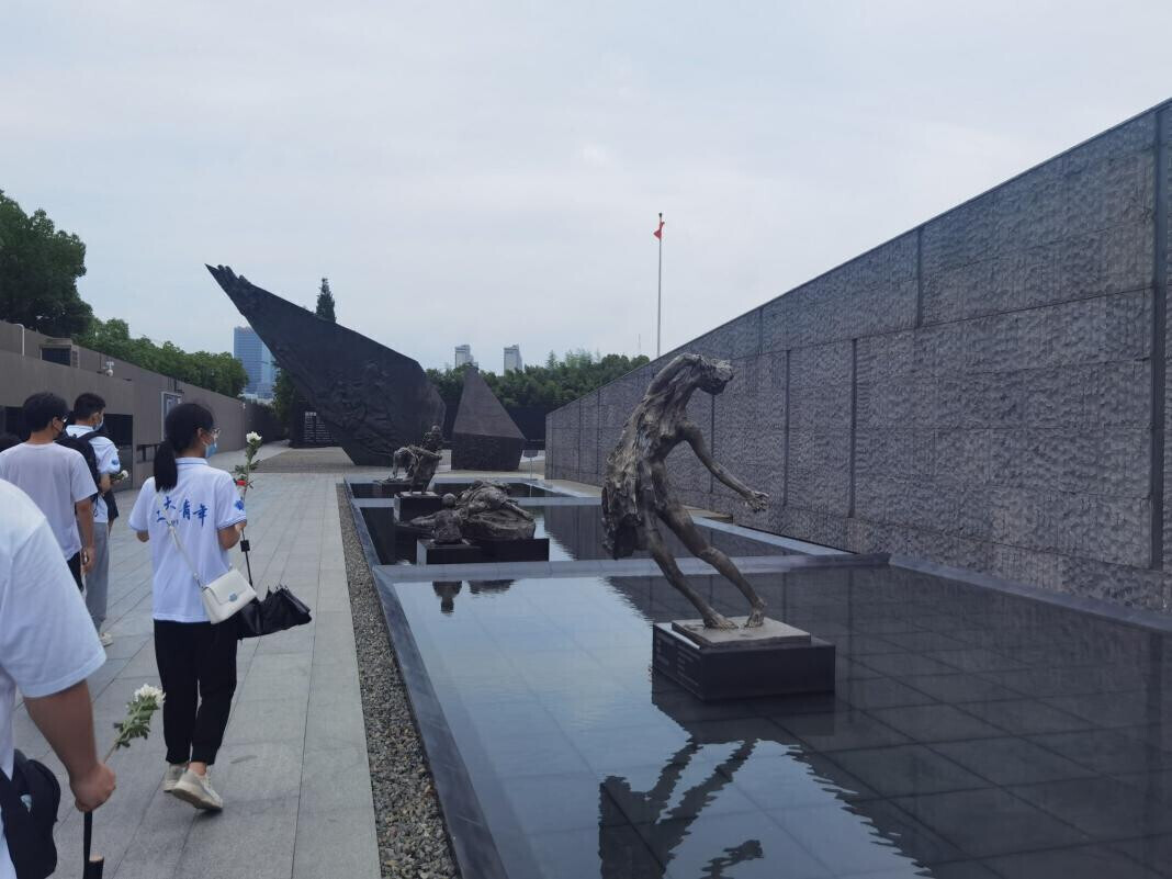 图为实践队的同学们参观侵华日军南京大屠杀遇难同胞纪念馆广场上的雕像群