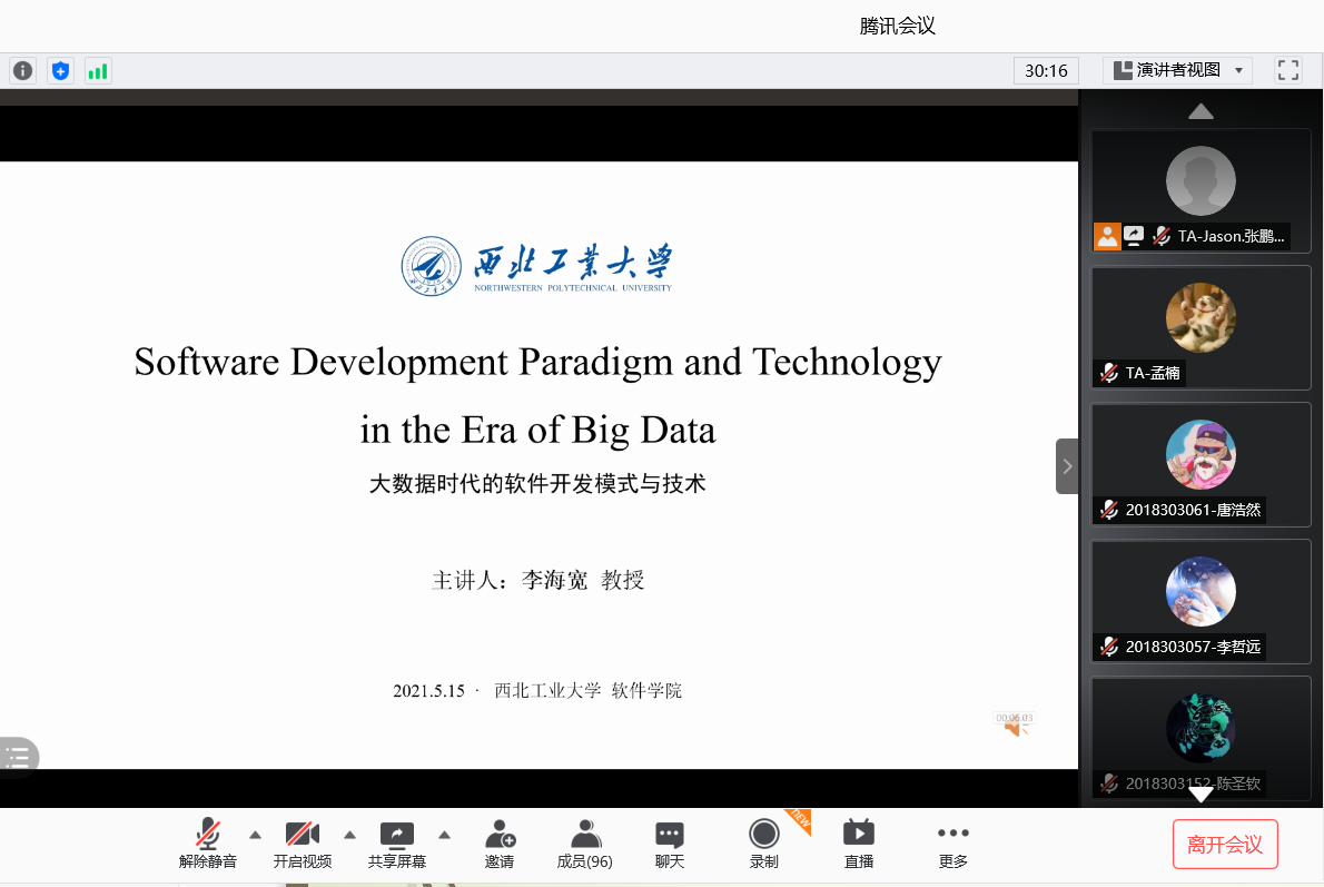 “大数据时代的软件开发模式与技术”(Software Development Paradigm and Technology in the Era of Big Data)全英文课程在线上顺利开课。本次课程邀请李海宽教授主讲,选课人群涵盖本科生、研究生和留学生,选课人数达124人。