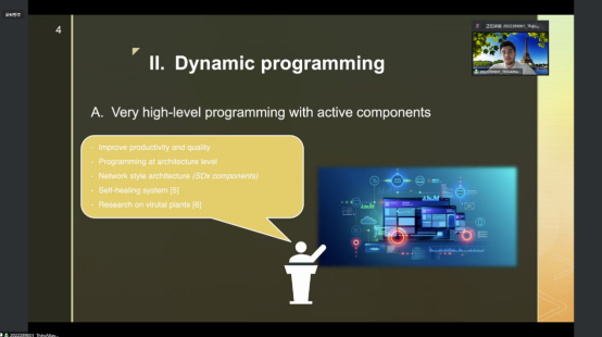 Seminar期间,学生们准备的十分充分,生动而又形象地介绍自己的课程paper。如学生在介绍“Dynamic programming”时提到 “Very high-level programming with active components”,这是李海宽教授在lecture最初的章节给同学们讲解的一个topic。学生们细心总结了李海宽教授的观点,并结合其他Scientists观点的基础上,得出了自己观点看法。这也是老师不断强调的观点“教师只是分享Cutting-Edge的研究情况,学生们有不同的看法是很好的”。